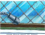 Ketika SpongeBob masuk ke Krusty Krab setelah membaca tulisan di tempat sampah, terlihat tanda "Dicari Bantuan". Jalan menuju Chum Bucket juga hilang.