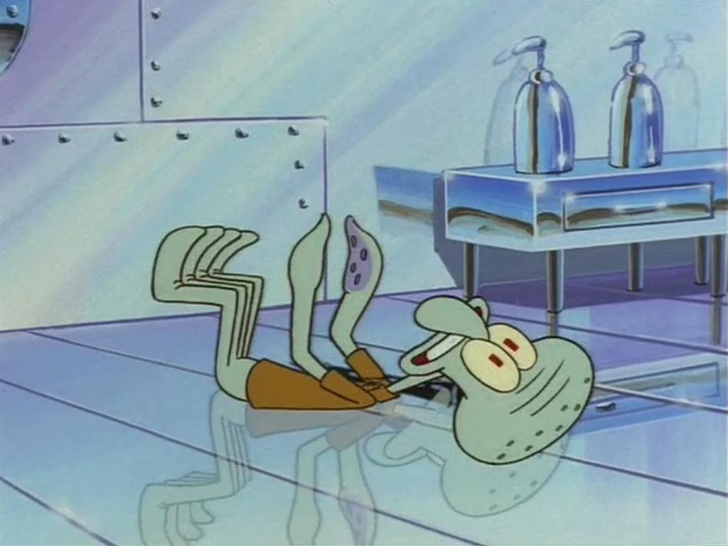 - Dalam "Funny Pants", SpongeBob tertawa kesal, sehingga ia mengatakan SpongeBob bahwa ia memiliki "kotak tertawa" yang akan terbakar jika ia tertawa dalam waktu 24 jam dan tidak pernah bisa tertawa lagi. SpongeBob akhirnya berpikir ia kehilangan tertawa dan masuk ke "depresi runcing" yang terbukti terlalu banyak untuk Squidward untuk menangani.