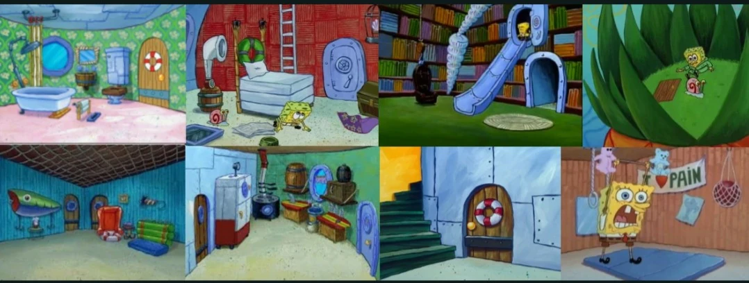 太平洋の海底にあるビキニタウン市124コンチストリートにある家。エピソード「スポンジ・ボブの真実」で見られるように、海の上を航行する船から落ちてきた。