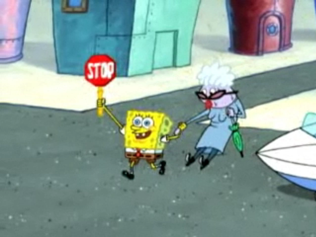 | Spongebob helpt een oude mevrouw oversteken. | |||