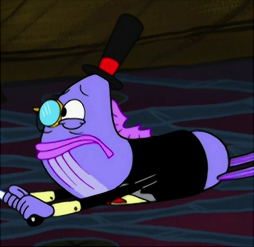 Он - фиолетовая рыба, которая носит черный костюм с белой майкой, стеклянный монокль на одном глазу и черный цилиндр.