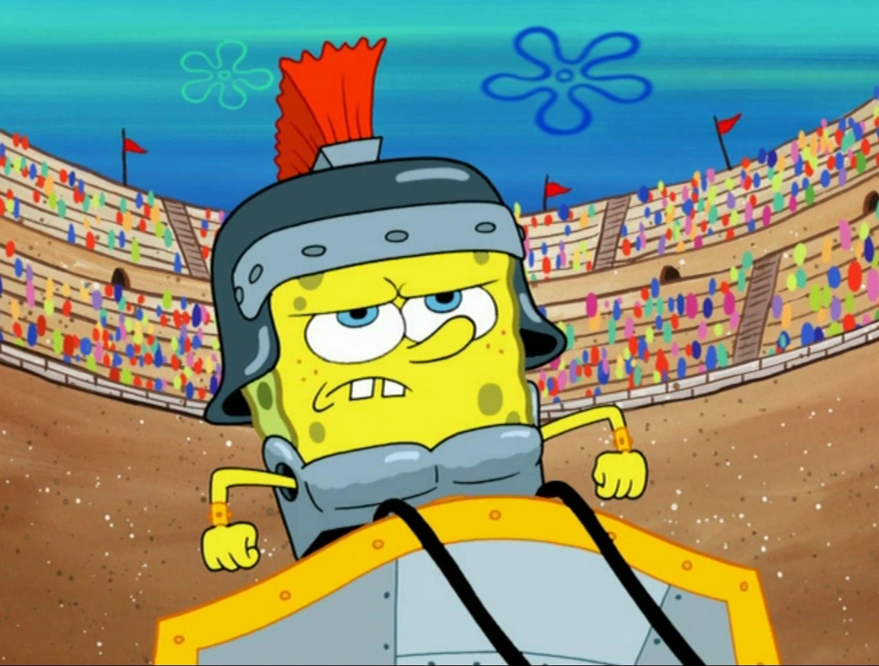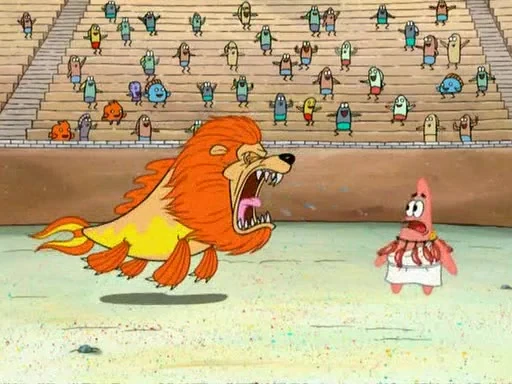 Уже в Колизее, Планктон приказывает выпустить на арену морского льва. Губка Боб был этим очень взволнован, пока не узнаёт, что противником морского льва будет Патрик. Чтобы соблазнить морского льва для погони за Патриком, Планктон приказывает надеть кровяные сардельки на шею Патрика. Губка Боб решает помочь другу, одеваясь как гладиатор и садясь в колесницу, запряжённую морскими коньками.