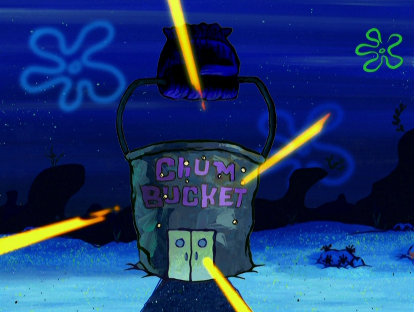 - Когда Патрик случайно раскрывает секретную миссию Планктону, тот на некоторое время приходит в замешательство, а затем решает, что они пришли пообедать в "Чам Баккет".