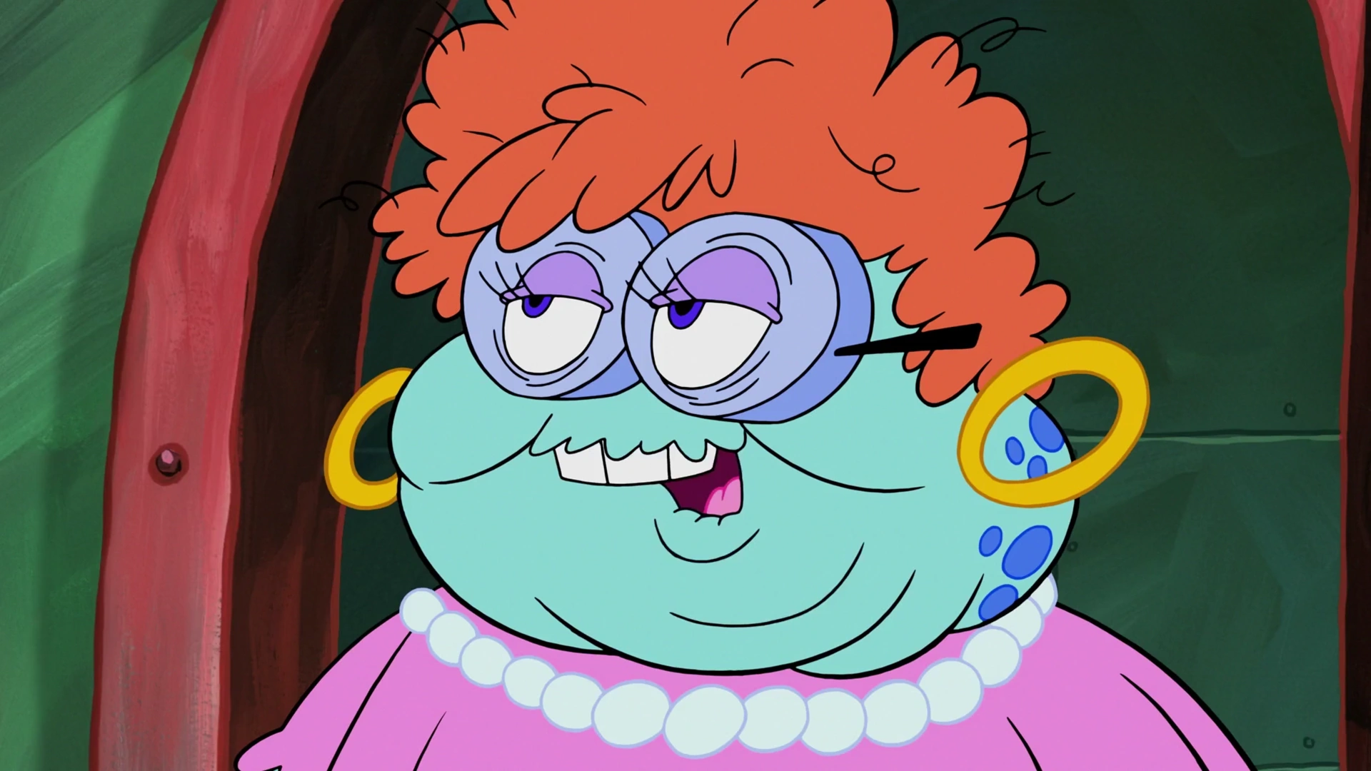 У нее рыжие волосы и светло-бирюзовая кожа со светло-фиолетовыми веками и синими пятнами на затылке. Она носит большие темно-синие очки, большие золотые серьги-кольца, ожерелье из белого жемчуга, зубные протезы и розовое платье.