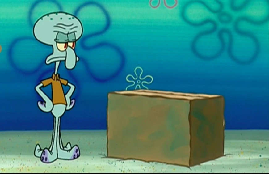 Когда Сквидвард собирается забраться внутрь коробки, морщины на его лбу исчезают на пару секунд.