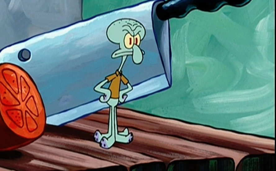 - Ножницы разрезают Сквидварда пополам.