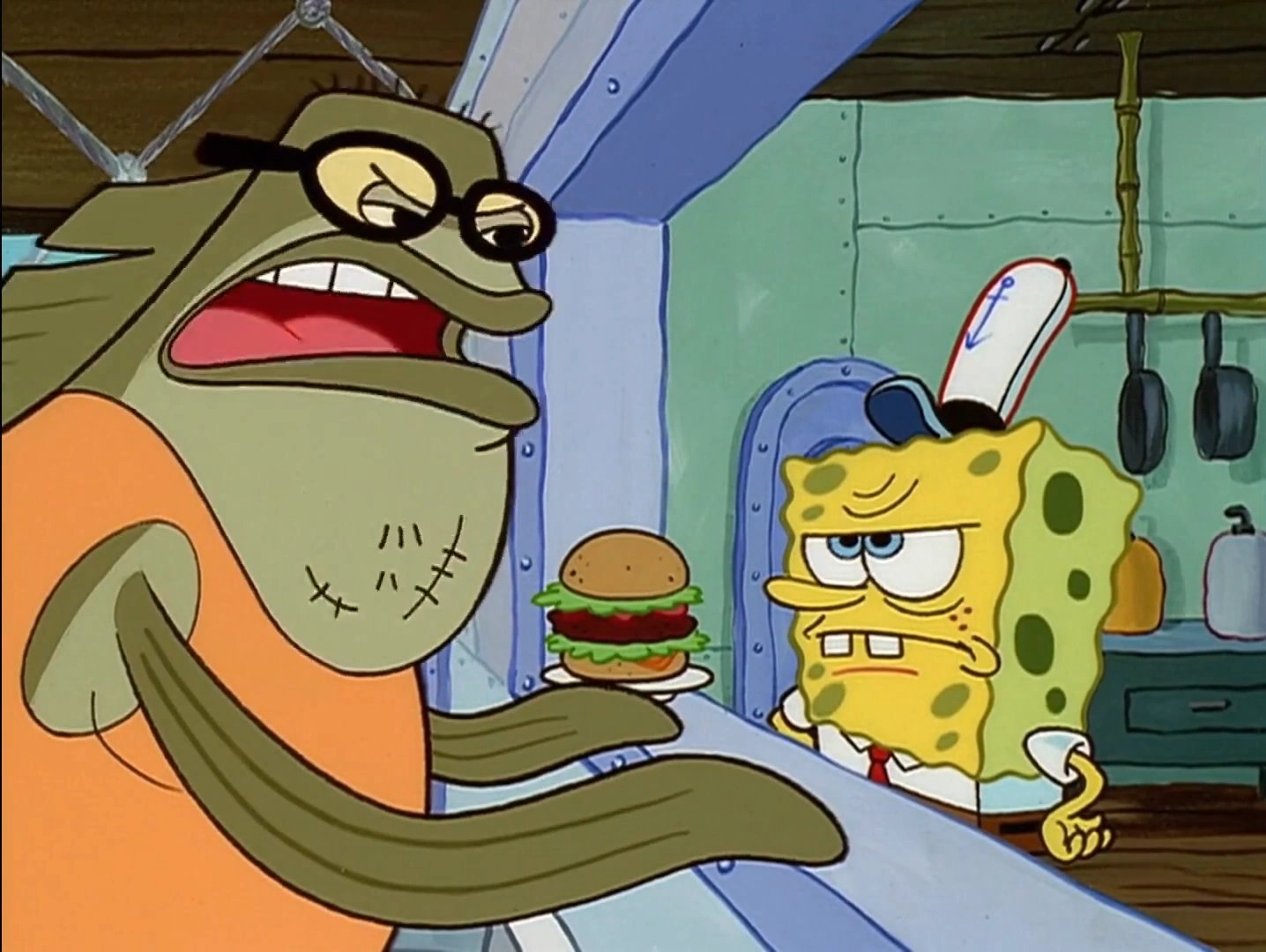 Когда Сквидвард говорит: "Двенадцать бургеров, побольше лука и салата", на короткую секунду его шея находится перед ртом.