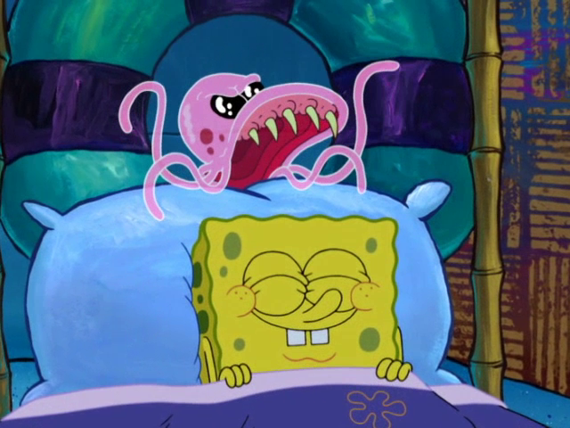 Губка Боб ложится спать вместе с медузой, которая хочет его поглотить, но он просыпается от бессонницы и идёт смотреть телевизор. Он начинает смотреть фильм ужасов, а медуза вновь пытается поглотить его, но Губка Боб бросает попкорн ей в рот, из-за чего она давится.