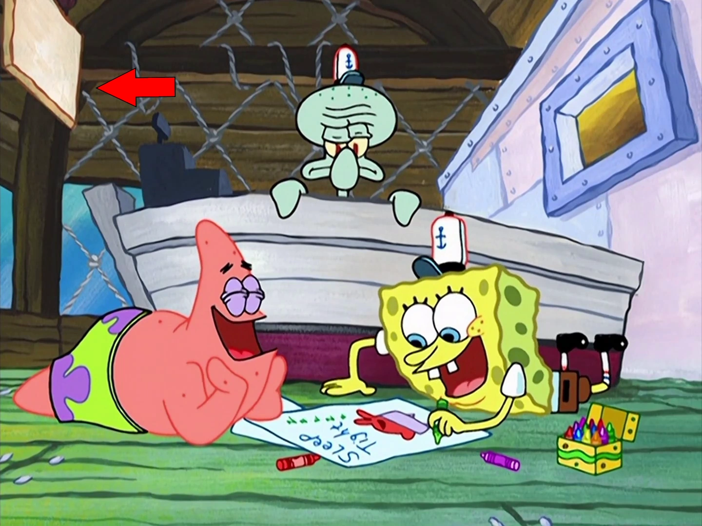 Когда Губка Боб и Патрик входят в магазин матрасов, они восклицают "Вау!" У Губки Боба отсутствуют молочные зубы.