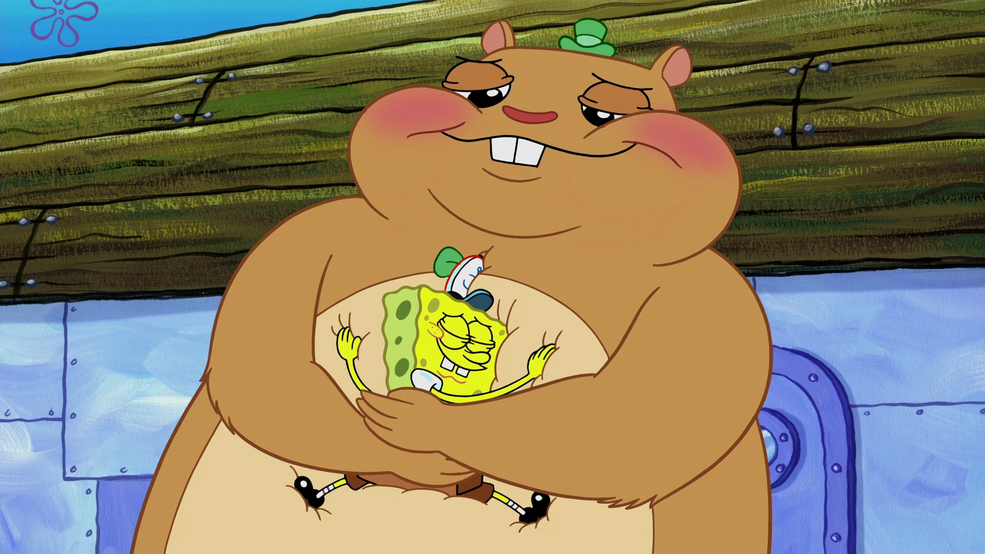 Когда Сэнди говорит: "Вы двое, развлекайтесь, слышите?" и уходит от Спанч Боба и Пуши Обнимаша, у последнего отсутствует шляпа.