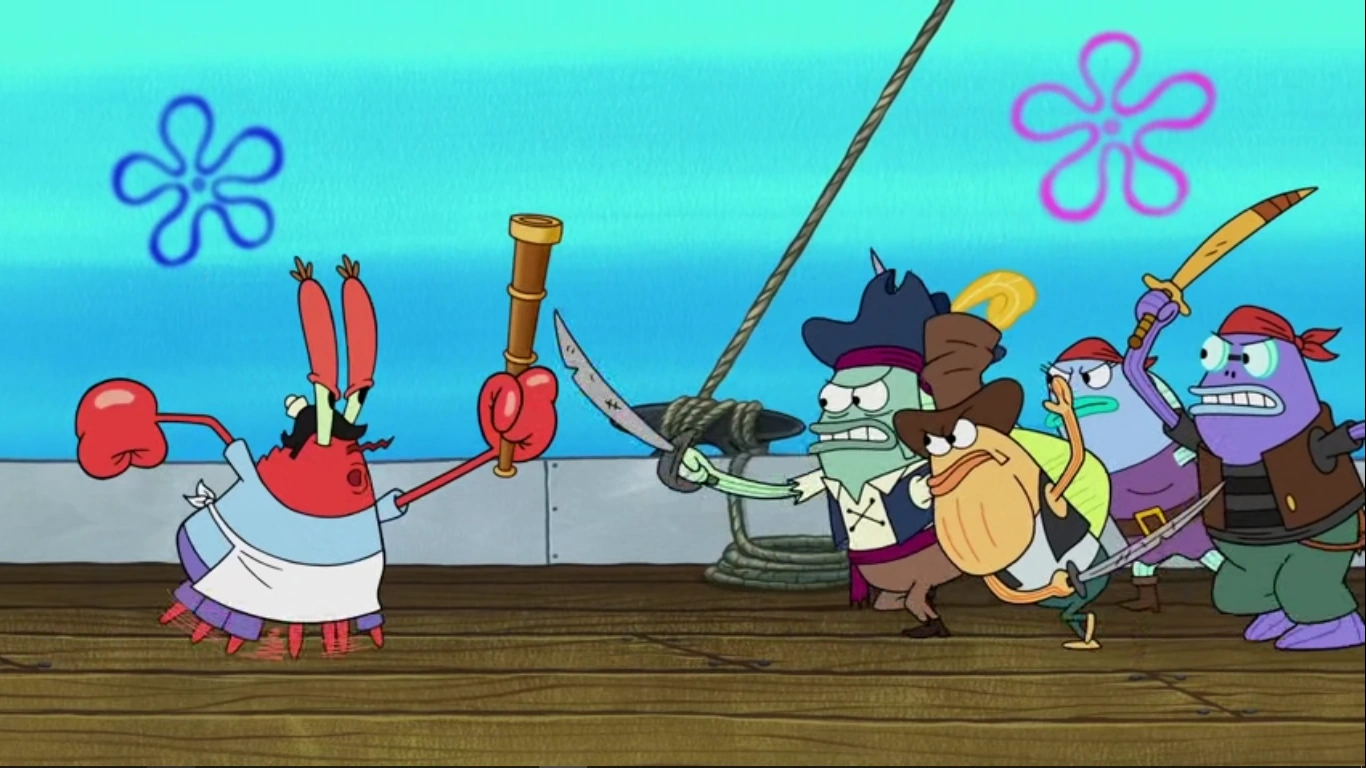 Капитана пиратов посадили в тюрьму. В конце мистер Крабс дал ей сладкий ключ, подмигивая. Тогда настоящие Губка Боб и мистер Крабс стали подмигивать друг другу, Сквидвард спросил, зачем они это делают, а Боб отвечает: "Не знаю".