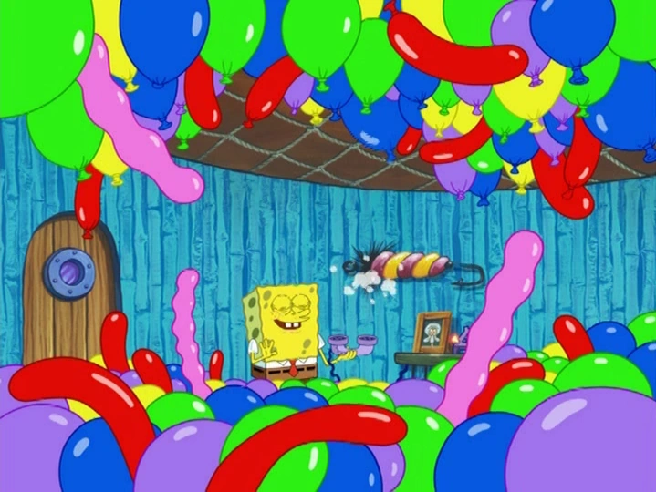 | Губка Боб и Гэри идут по улице, когда с неба падает оранжевый дирижабль. | ||||||