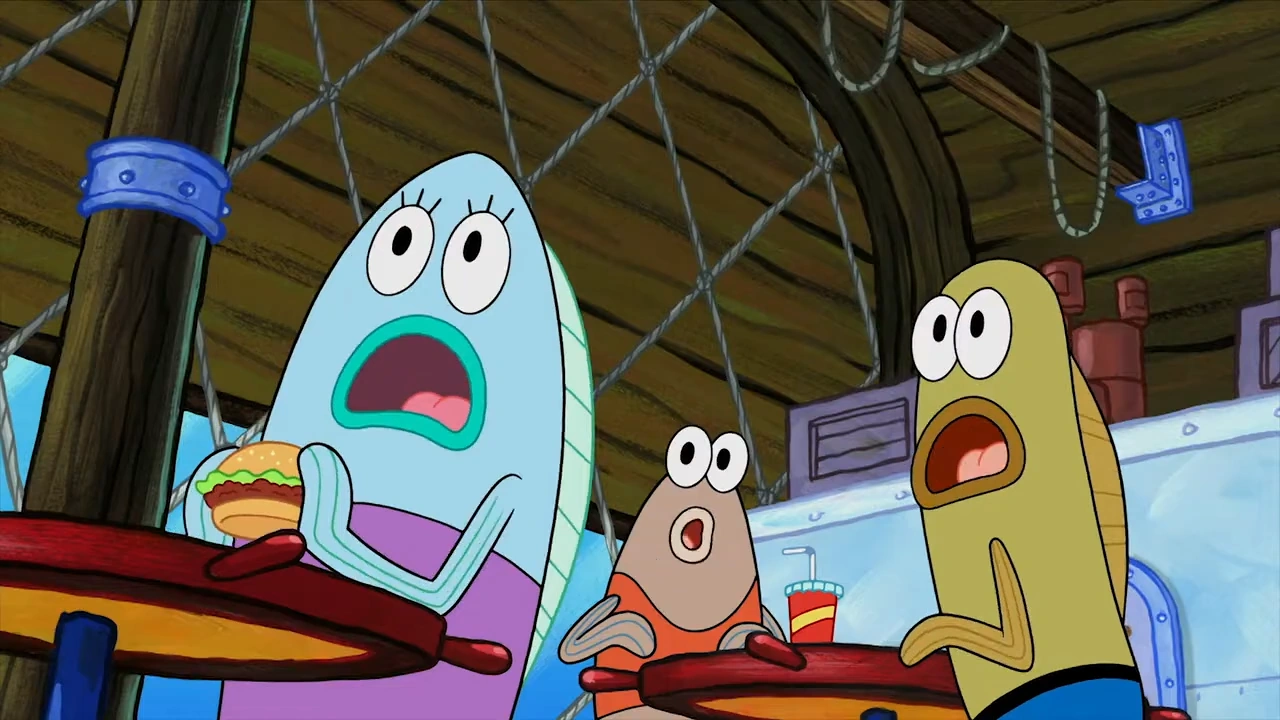 | Окунёк Перкинс и Патрик дерутся за крабсбургеры. | ||||||
