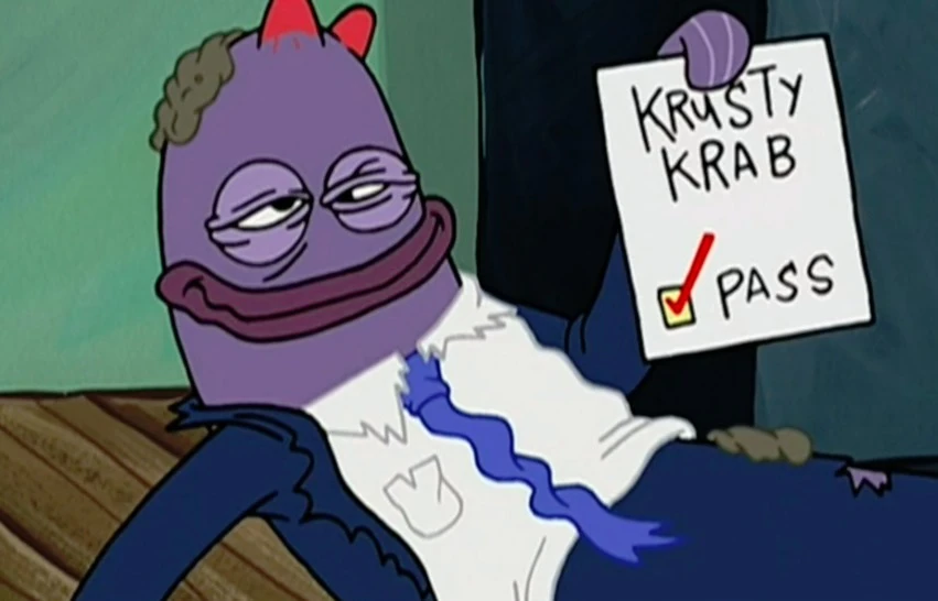 Одним ярким солнечным утром в "Красти Крабе" мистер Крабс принимает ванну из денег, но внезапно санитарный инспектор прибывает с проверкой. Мистер Крабс приказывает Губке Бобу принести ему всё, что надо, что Боб и делает. После того, как Крабс и Боб кормят инспектора кучей блюд, он заказывает один обычный крабсбургер, и тогда он закончит проверку. Между тем, по новостям говорят, что некий самозванец выдаёт себя за санитарного инспектора, чтобы получить бесплатную еду. Возмущённый такой новостью, мистер Крабс принимает инспектора за мошенника и решает проучить его, приготовив "тошнотный бургер" из острого соуса, хрена морского конька и стриженных ногтей. Этот бургер Губка Боб роняет его в унитаз, а мистер Крабс вытирает его своим спортивным носком.