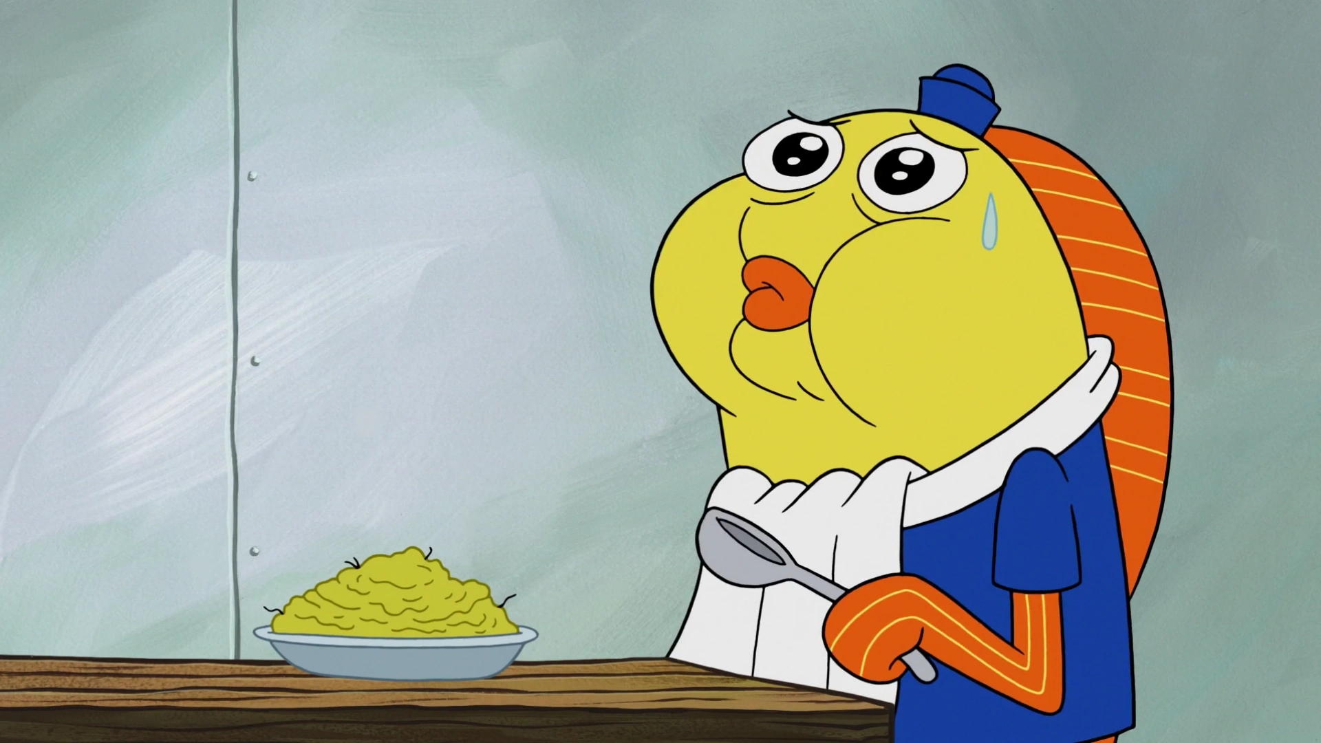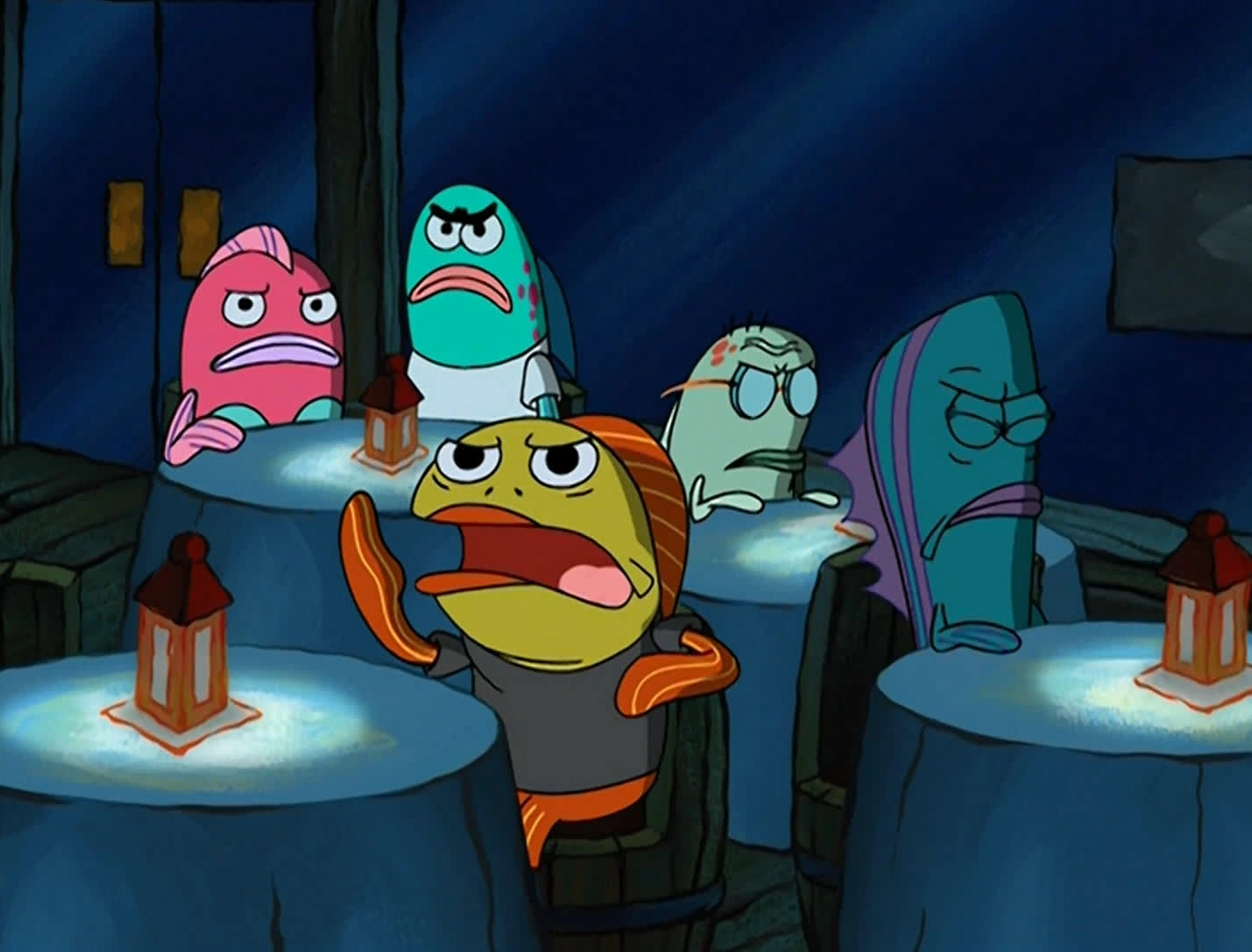 Приходит в дом Губки Боба с Мэри и Фоновым 37А, и заказывает у Губки Боба крабсбургеры.