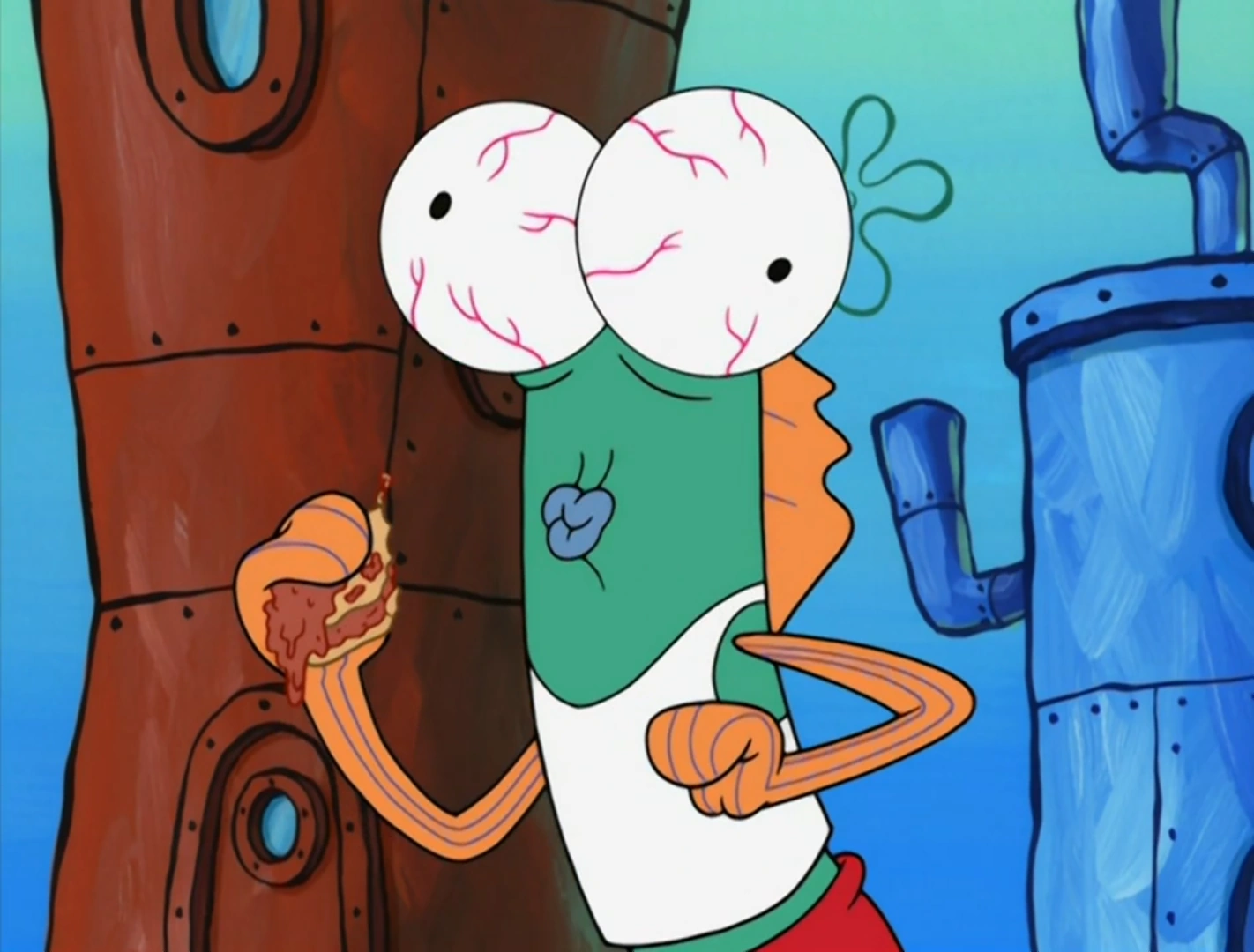 Он очень жирный, и лежит рядом с кучей мусора. Но Губка Боб пропылесосил его, сделав из него мускулистую и красивую рыбу.