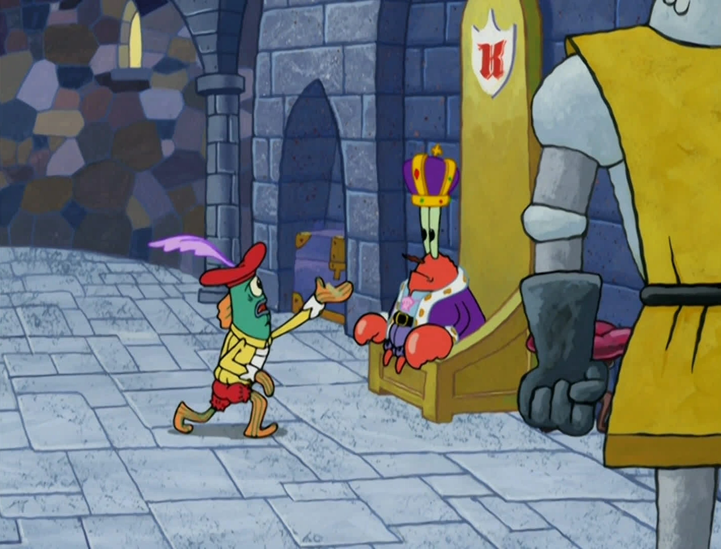Eго средневековым вариант выглядит как королевский гонец, доставляющий письмo от Планктонамора Королю Крабсу.