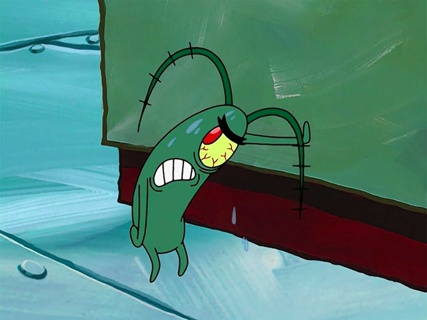 - Губка Боб всегда просит его оценить его работу и закатывает небольшую истерику, если Планктон отказывается. Он также страдает нервными срывами, когда признаётся виновным в незначительных ошибках, таких как использование слишком много соуса в крабсбургере или выдача клиенту заказа по ошибке.