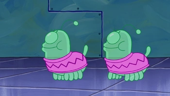 Это два щенка, которые выглядят одинаково. Ростом они примерно как Планктон. Носят розовые свитера. У них по антенне и четыре ноги на каждой стороне тела.