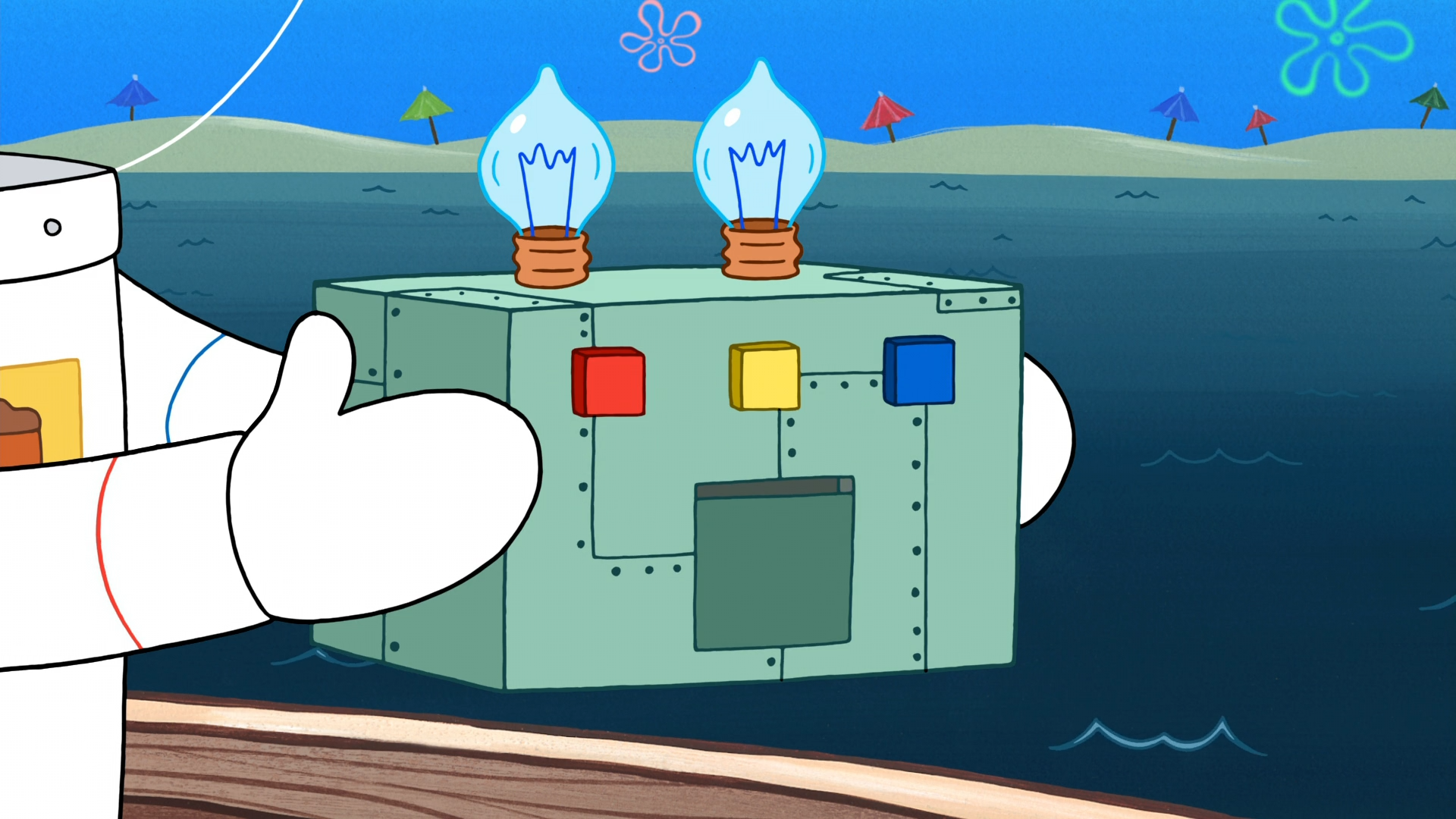 As one of the tests Sandy conducts on the giant super goo bubble, she tells SpongeBob and Patrick to put some of the goo in a bucket. She then tells SpongeBob to put said goo into the analyzer to see how dangerous it is. The analyzer then becomes sentient, as it starts to chew on the goo, before spitting it out and somewhat malfunctioning (breaking one of its lightbulbs in the process). The analyzer then has a receipt come out of the mouth of it, which Sandy takes and sees that the goo is worse than she thought.