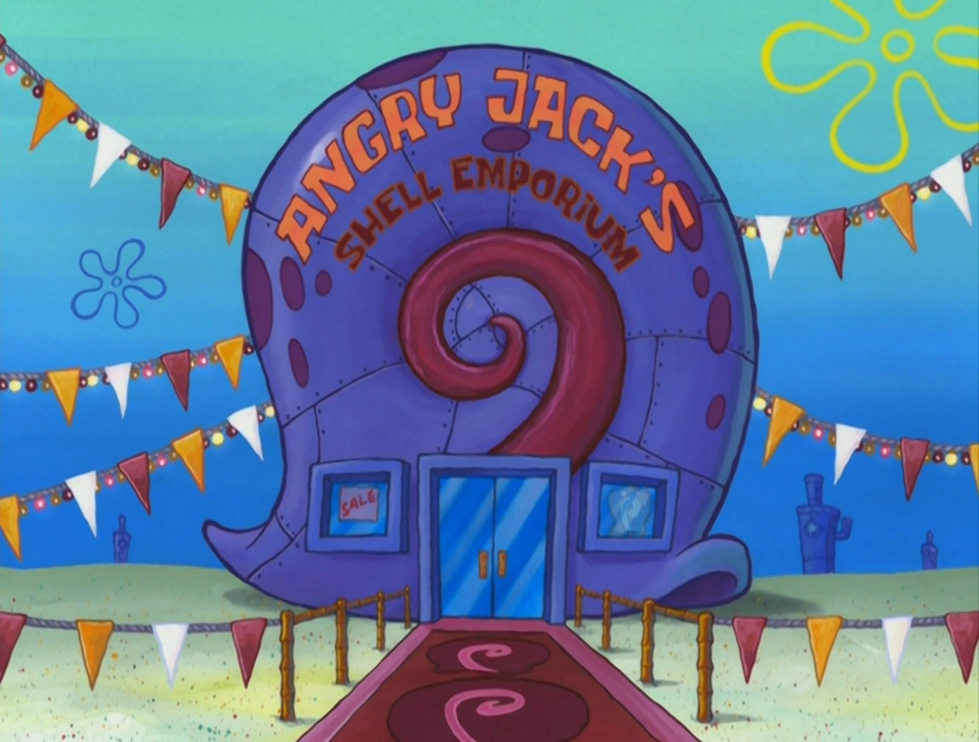 Angry Jack's Shell Emporium is a shell emporium that sells snail shells, owned by Angry Jack. It appears in the episode "Shell Shocked," the book SpongeBob DetectivePants in the Case of the Lost Shell, and the game SpongeBob Adventures: In a Jam!.