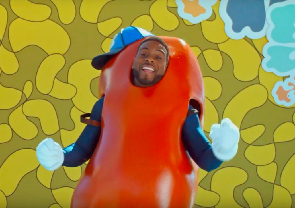 He is a man in an orange bean suit who wears a sideways daddy cap with a blue shirt and light blue gloves. He wears jeans and black shoes with white laces.