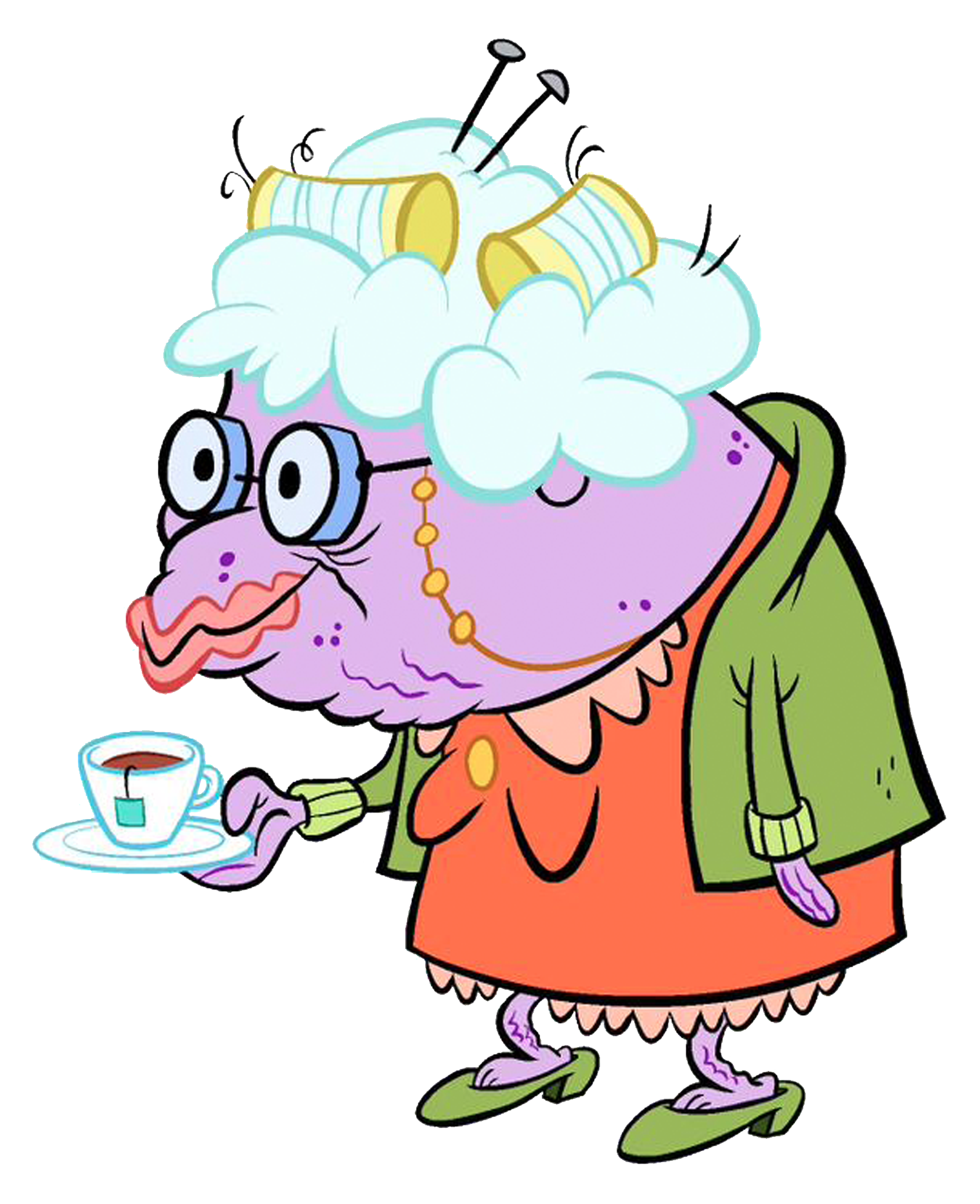 She is a light wrinkly purple fish with white hair that contains yellow hair curlers and nails. She has black eyes, wears glasses, has an orange dress, a light green wool cardigan and green high heels. She wears pink lipstick.