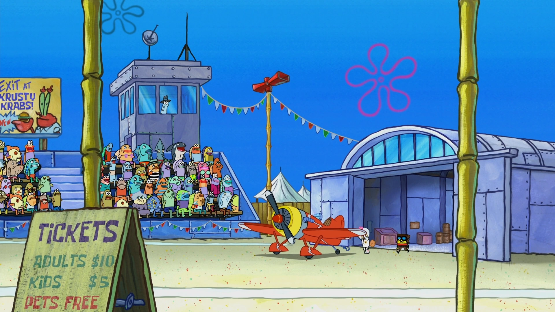 - Eugene H. Krabs is seen on a billboard advertisement in the air show crowd.