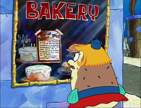 SpongeBob goes here to buy a cake for Sandy as she went on vacation to the moon. He asks Incidental 39 to write "Have fun on the moon," before thinking of words that rhyme with "moon." When the baker suggests "loon," SpongeBob says that "See you soon" should be written.