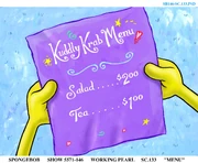 The Kuddly Krab quickly becomes a hit with the teenage crowd. SpongeBob is told to make a salad, which he never heard of, so he makes a Krabby Patty and shows it to Pearl. Disgusted, she orders him to take off the buns and the patty, leaving only tomatoes and lettuce. Upon returning to the kitchen, SpongeBob is horrified to see that his grill is gone. Pearl explains to him that Krabby Patties are no longer "hip," and that they now serve only tea and salad. SpongeBob is then given a humiliating mascot costume to wear out front, and this is the final straw for him. He goes to Mr. Krabs' office to complain.