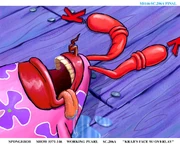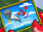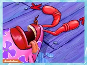 Squidward remains the only holdout and shakes the newly designed sign in frustration. Two passersby are disappointed the Krusty Krab is seemingly gone and, thinking Squidward is a woman, ask him where a place to eat is. Enraged, Squidward quits on the spot and rips off his costume.