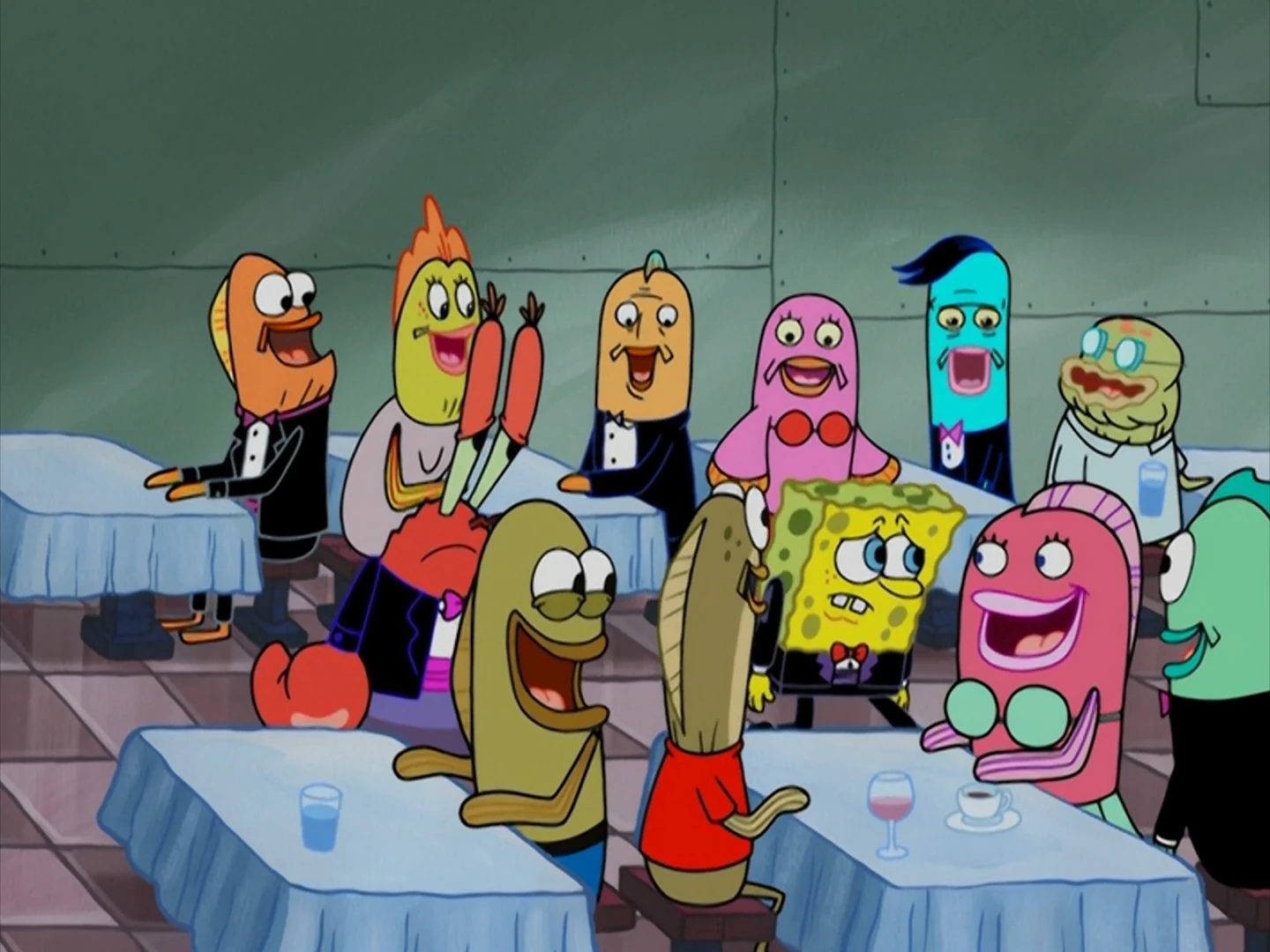 The chum leads to the opening of a new restaurant using Squidward as the chef and the same structure of the Chum Bucket. The restaurant is called Le Chum Bucket and the chum is called "Chum Fricassee," prepared only by Squidward. Squidward becomes a big hit while the Krusty Krab appears to have no customers. At first, what looks like a customer at the Krusty Krab is later revealed to be a customer from the Le Chum Bucket. He was at the Krusty Krab because the Le Chum Bucket was full of customers. SpongeBob and Mr. Krabs sneak into the Le Chum Bucket as fancy customers, as they assume only fancy people dine there. Once they gain entry, Mr. Krabs warns SpongeBob that these are classier people and do not raise their voice as SpongeBob does. When they approach the reservation desk with Karen as the reservation seeker, Mr. Krabs makes up a fake alias to gain entry as "Mr. Crumbled O'Wrapper." Karen does not see a reservation for a Sir Crumbled O'Wrapper, yet she does offer a reservation and seat within two years, which angers Mr. Krabs. Squidward enters the scene and annoyingly asks Karen what the problem is, but after seeing SpongeBob and Mr. Krabs in disguises, he fans their mustaches and reveals their true identities to everyone. He gets revenge on Mr. Krabs for his earlier treatment by taking them to the bathroom, where he places a tablecloth on the toilet rim, calling them suckers and gives them "Bon Appetite," in a very sarcastic tone, making the entire restaurant laugh at them.