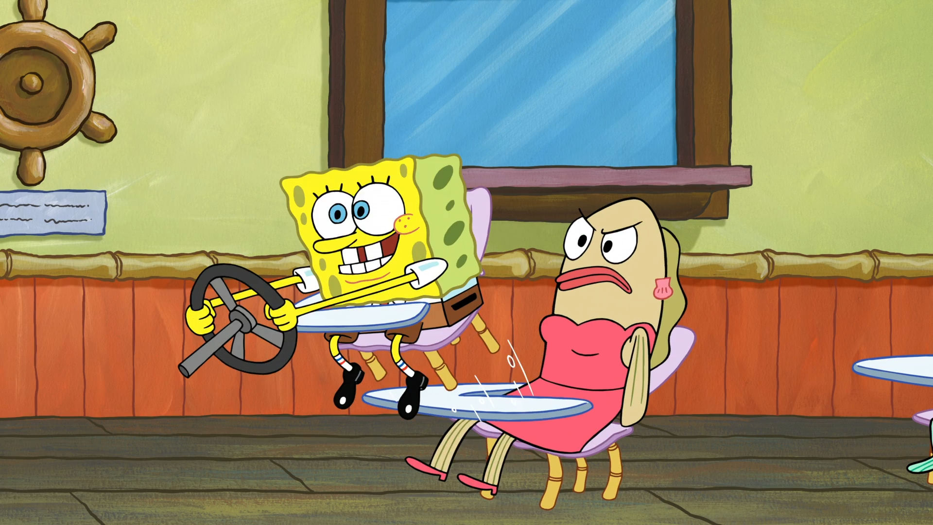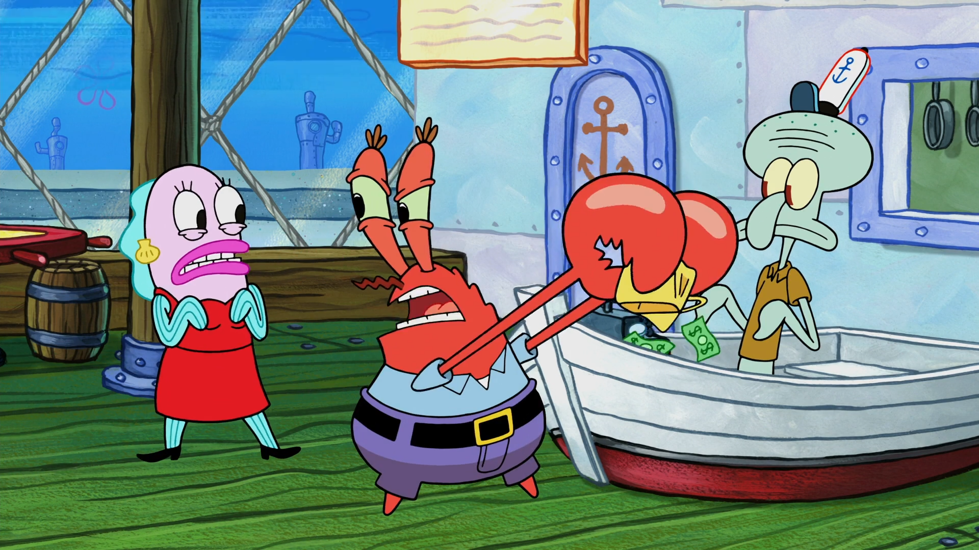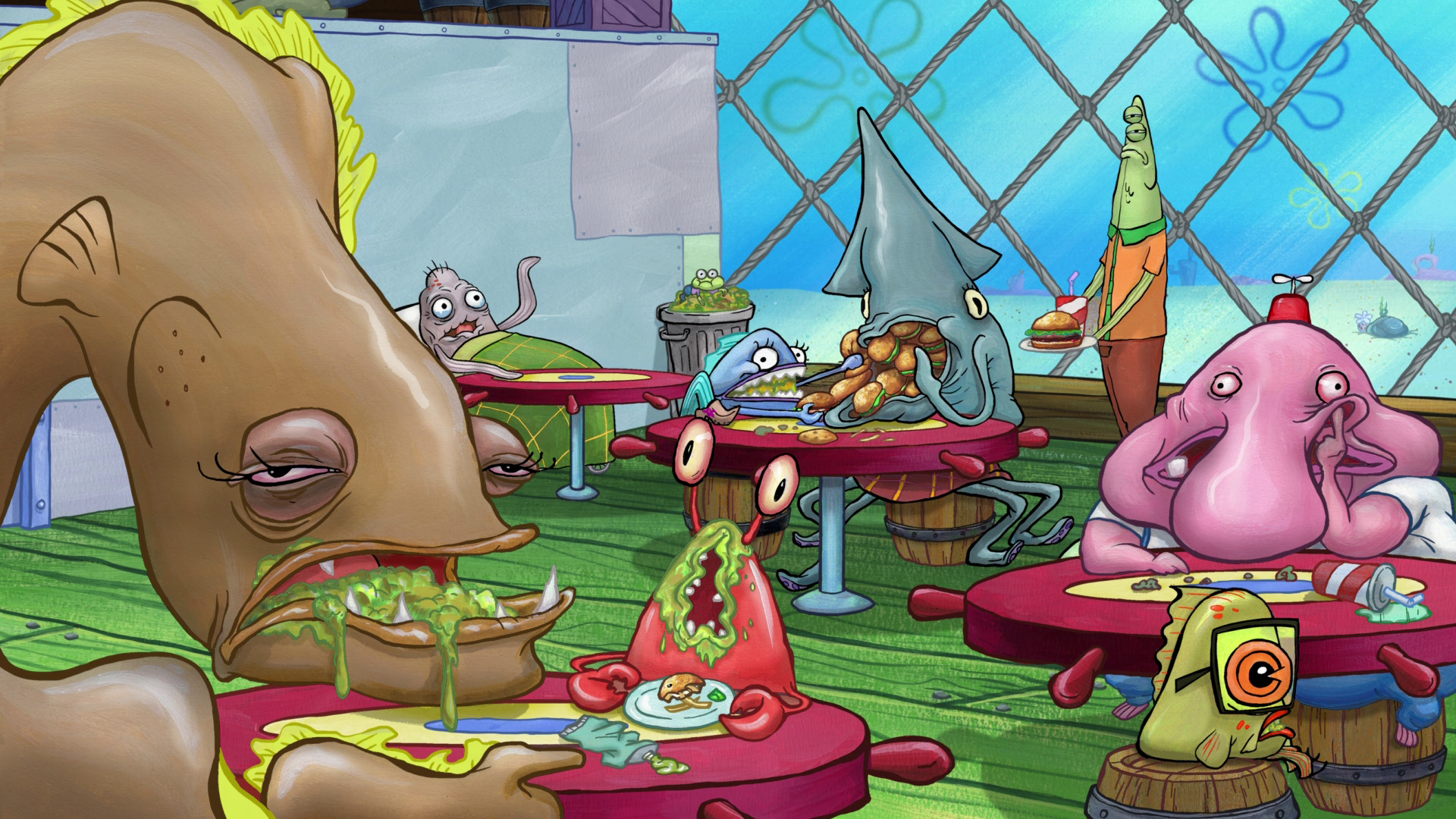When Squidward tries to sell Teen 7's son a painting, she and her son scream in horror and run out of the Krusty Krab.