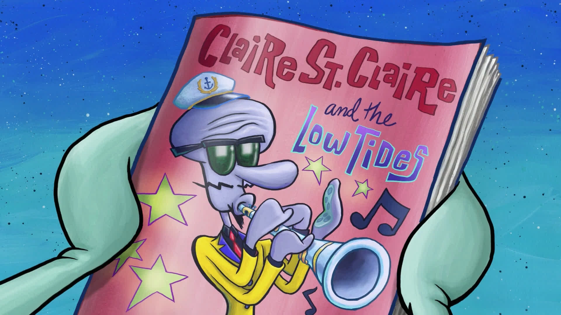 Afterwards, Claire St. Claire comes to the stage and says that Squidward played really well, and Squidward faints from happiness.