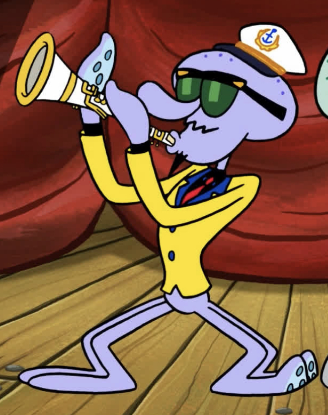 He is a purple octopus who wears a cap with a little blue anchor symbol in the middle (similar to the Krusty Krab employee hat), green sunglasses, a red tie, and a yellow vest with a dark blue neck. He has a thin black mustache and a goatee.