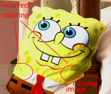 - During the ending scene when Cuddle E. Hugs wakes up in the real world, a large SpongeBob plush beside the bed has multiple errors: Part of its body is missing, and part of its shirt and one of its holes are the same color as its skin.