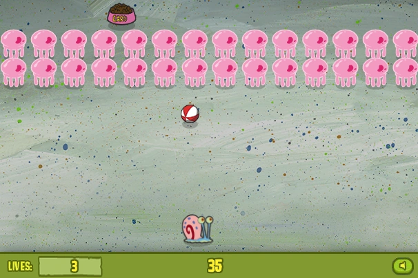 Gary is hungry, but the jellyfish are blocking him from his food bowl. Help Gary get rid of the jellyfish by bouncing a ball back and forth on the screen. The player will move to the next level when the ball touches Gary's food. As the player progresses, more rows of jellyfish appear. The highest it goes up to is four rows of jellyfish.