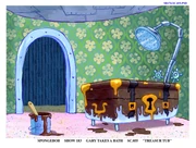 In the still shot of SpongeBob's "treasure map," the wallpaper is the one of his living room even though SpongeBob is holding it up in the kitchen.