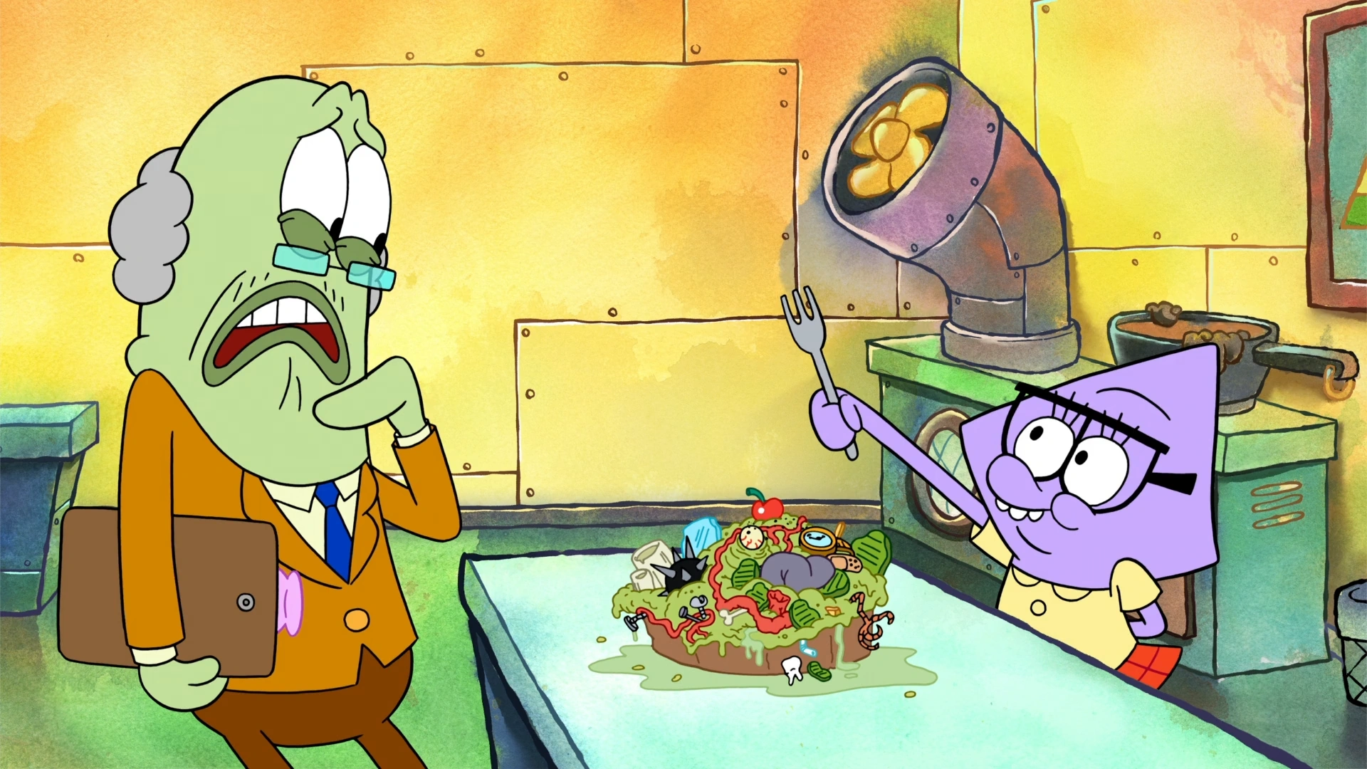 At the Bikini Bottom School, a teacher is sampling his student's cooking for Home EC. The first two are good, but he comes to Squidina, who presents a messy and disgusting-looking dish called pickle pie. Her teacher is hesitant to try it, recalling her past dangerous projects. Squidina convinces him, and after one taste, he is taken to the hospital.