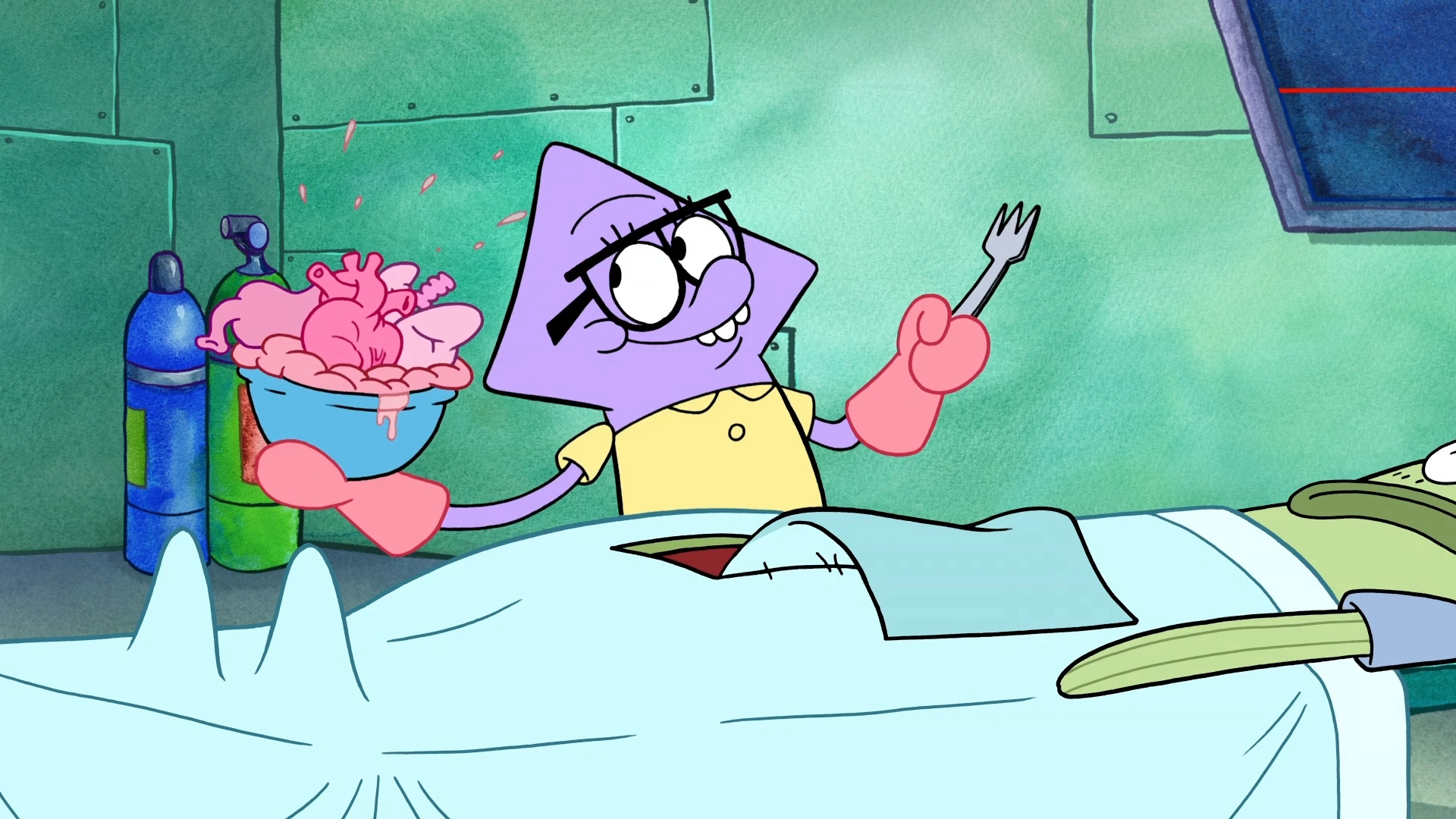 - When the teacher asks Squidina about her finished pickle pie, his hand is colored a lighter shade of green for a frame.