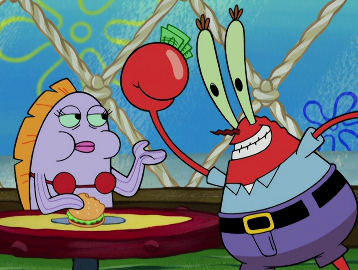 She gives Mr. Krabs a stack of cash during the song "The Feeling of Greed."