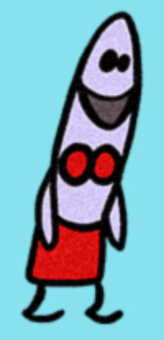 It is a distant incidental with Incidental 12's color palette appearing as a tall and thin lavender fish who wears a red bikini and skirt who has dot eyes.