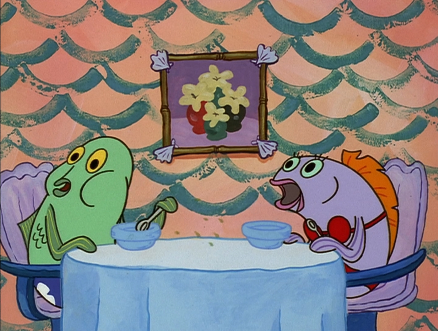 She appears at a high class fancy restaurant with Fred. She gets her blonde wig, clothing, and accessories stolen when SpongeBob and Sticky Fins Whiting come dashing through the restaurant.