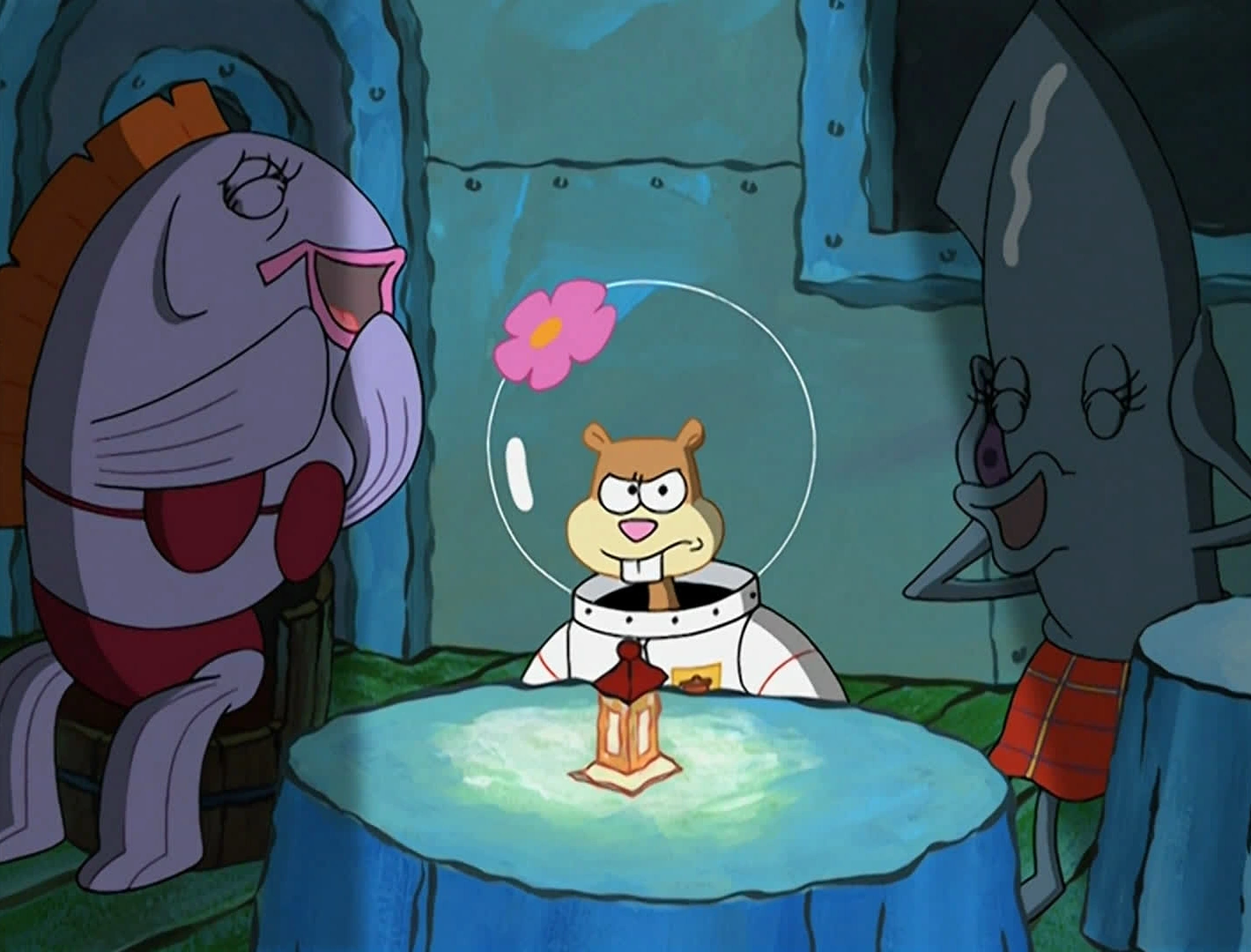 She is part of the audience that constantly cheers for Larry the Lobster and Sandy's weightlifting in many shots.