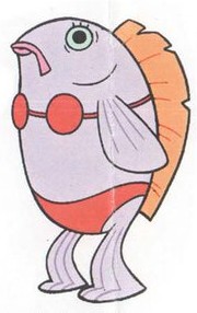 She is a light purple grouper who has an orange dorsal fin, pink lips, and light blue eyes with black pupils. She wears a red bikini. In her older appearances, she had thin black feet.