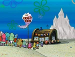 Fred stretches a Krabby Patty with jellyfish jelly right in front of his face during his song.