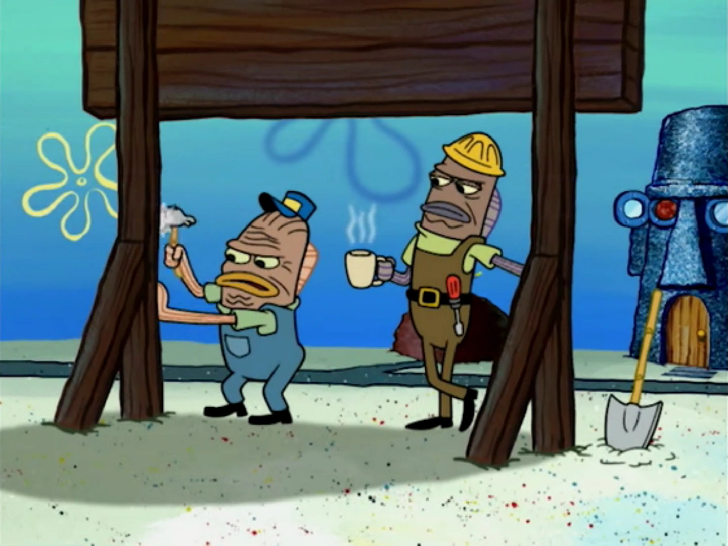 He is shown building a sign along with the construction foreman for the Bikini Bottom Symphony Orchestra.