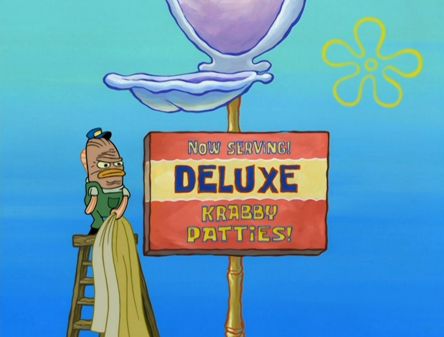 He reveals an advertisement sign on the Krusty Krab clam pole for new Deluxe Krabby Patties, which he was required to make due to the rise in sales for grease products.