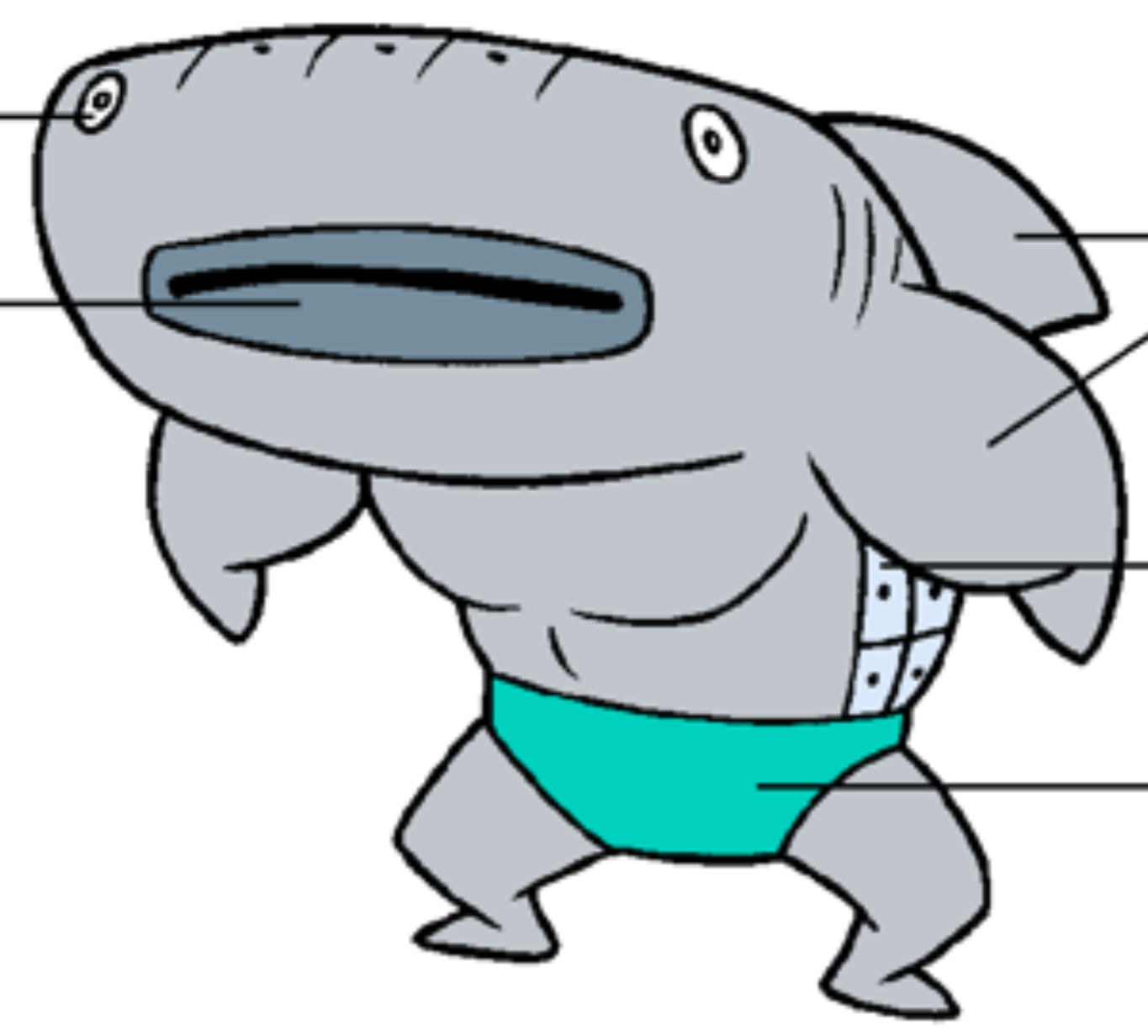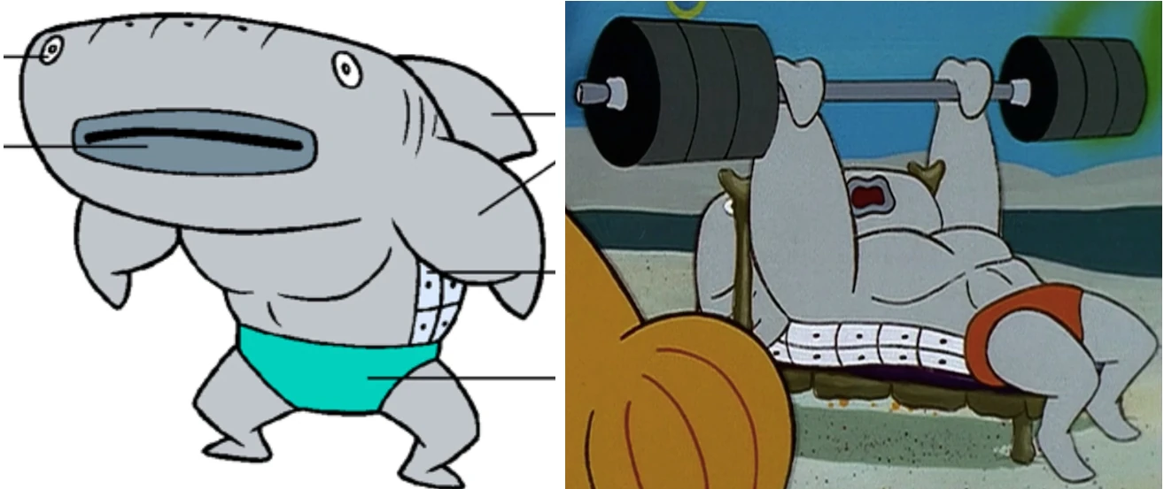 He is a light gray muscular whale shark. On his back, he has the distinctive line-and-dot markings that whale sharks are known for. He has gray lips, small eyes, visible gills, and wears a mint green speedo. Although the mint green speedo he currently wears was originally considered as the speedo he wears in his preliminary colors for his old colors variant, which consists him of wearing a red-orange speedo. Weight lifter 2 has the exact same appearance as Incidental 24A.