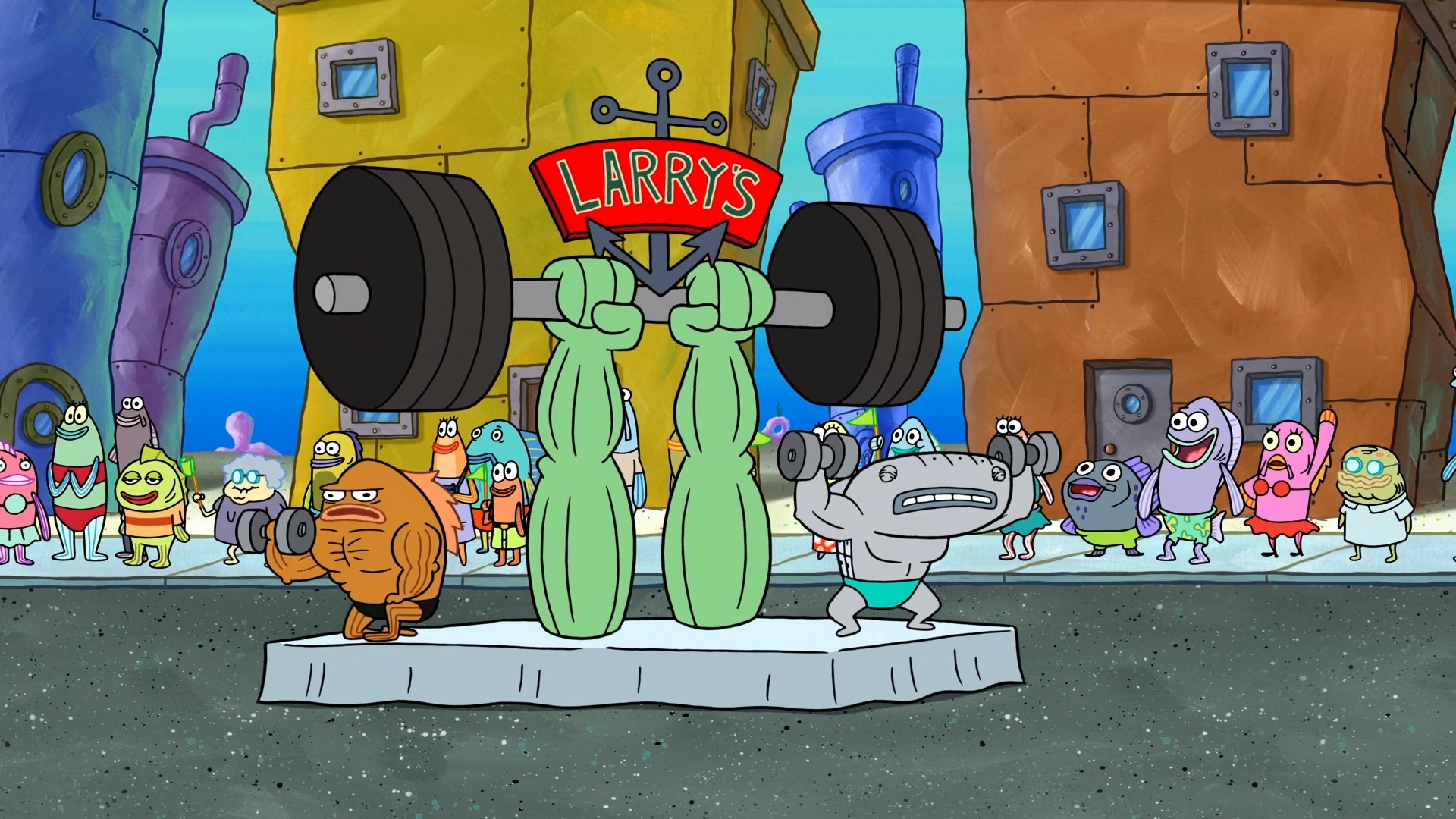 He is part of the parade float for Larry's Gym, shown lifting a dumbbell in each hand. He falls off the float when Bubble Bass's weight causes it to collapse.